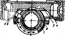 Их выпускают в одинарном и сдвоенном исполнении типен РГ и 2РГ на крутящие моментм2,5-80 кН. м. Особенность \ устройства заключается в объединении двух соосных цилиндров в один цилиндр, названный моментным, с общ; м двусторонним плунжером 5. Последний по обоим концам уплотнен манжетами 4, а в остальной его части по длине, сделан вырез 8, в котором нарезала ьС чатая рейка 9 для сцепления с шестерней 6, насаженной па шпонке на баллер 7 рулевого органа* Сверху и снизу исполнительный механизм закрывается крышками с уплогиительными манжетами. Номинальное рабочее давление масла в этих машинах составляет 6,5-8,5 МПа. Преимуществом рулевых машин с плунжерно-реечным приводом являются малые габаритные размеры и масса.