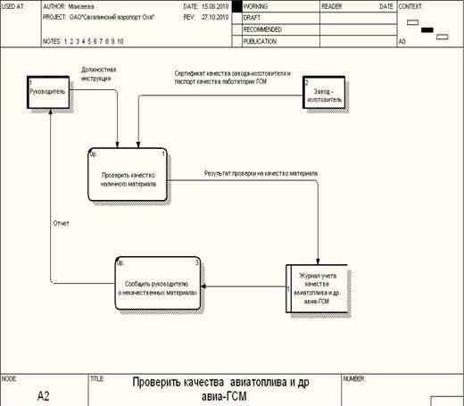Второй функцией является проверка качества авиатоплива и др. авиа-ГСМ. В качестве входа можно рассматривать ту информацию о наличном материала, которой располагают работники отдела на момент проверки. А выходом является запись в “Журнале качества авиатоплива и др. авиа-ГСМ”.