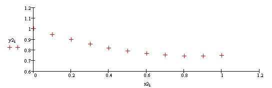 Для того чтобы построить график приближенного решения, щелкните в панели Graph по пиктограмме декартова графика, введите в помеченной позиции возле оси абсцисс имя первого столбца матрицы Y, содержащего значения x в узлах сетки, а в позиции возле оси ординат - имя второго столбца, содержащего значения приближенного решения в узлах сетки; затем щелкните по свободному месту в рабочем документе вне поля графиков.