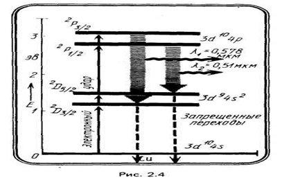 Упрощенная схема уровней атомов меди приведена на рис. 2.4. Два близко расположенных уровня и с временем жизни 0,4 и 0,8 мкс эффективно возбуждаются электронным ударом при накачке, осуществляемой мощным импульсным электрическим разрядом. Инверсия создается относительно метастабильных уровней и с временем жизни около 1 мкс. Коэффициент усиления активной среды достигает 1000 дБ/м. Мощность генерации на зеленой линии (l=0,51 мкм) намного больше, чем на желтой (l=0,58 мкм). Длительность импульсов составляет 5—10 нс. Основные трудности при создании лазеров на парах меди связаны с высокой рабочей температурой, необходимой для перевода меди в парообразное состояние (более 1600°С), и исключительно высокой скоростью нарастания переднего фронта возбуждающего импульса тока (более10А/с). Наиболее распространенной является конструкция в виде эффективно охлаждаемой трубки из высокотемпературной керамики на основе оксидов Al или берилия длиной до 1 м с внутренним диаметром 1—6 см. Внутри трубки размещены колечки или отрезки медной проволоки, введены электроды, на которые подают крутые короткие импульсы длительностью 200-300 мкс. При этом ток в импульсе достигает 200—400 А, а длительность переднего фронта составляет 0,03—0,1 мкс. Параметры трубки и разрядного контура подбирают так, чтобы установившаяся температура внутри трубки достигала 1600°С, а давление паров меди более 100 Па. Такой режим работы называют саморазогревным.