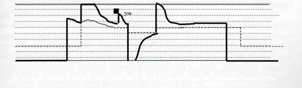 Для отражения на регистрирующей ленте целостности ТМ, хвостовой осмотрщик вагонов по команде оператора производит продувку тормозной магистрали открытием концевого крана хвостового вагона на 3 - 5 сек.(осмотрщик вагонов должен соблюдать правила ТБ). Тормозная волна приходит в голову состава и вызывает резкое (скачком) увеличение утечки воздуха в ТМ, что отражается на индикаторах блока и записывается на диаграммную ленту (момент 08:55). Стрелка стрелочного индикатора при нажатой кнопке ПЛОТНОСТЬпоказывает увеличение утечки сжатого воздуха, а цифровой индикатор увеличивает свое показание на 1.