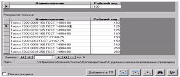 Результаты поиска появляются ниже в окне. При перемещении курсора по строкам внизу этого окна высвечивается наименования классификационных признаков группы, из которой получена строка. Например, «Тиски\Неповоротные\С ручным механизированным приводом».
