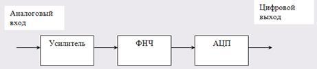 Так как максимальная амплитуда входного сигнала (по заданию) 1,5 В, а диапазон входного однополярного напряжения микросхемы 0,5...+10,5 В, то для повышения точности работы АЦП используем предварительный усилитель напряжения. Также необходимо на входе АЦП установить фильтр низких частот. Такой фильтр предотвратит появление из-за стробоскопического эффекта "лишних сигналов" во время преобразования аналогового сигнала в цифровой [1]. Такие сигналы воспринимаются как помехи и могут существенно исказить исходный вид преобразованного сигнала.