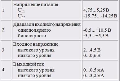Микросхема представляет собой функционально законченный 10-разрядный АЦП [2], сопрягаемый с микропроцессором. Обеспечивает преобразование как однополярного напряжения (вывод 15 соединяется с выводом 16) в диапазоне 0...9,95 В, так и биполярного напряжения в диапазоне -4,975...+4,975 В в параллельный двоичный код. В состав ИС входят ЦАП, компаратор напряжения регистр последовательного приближения (РПП), источник опорного напряжения (ИОН), генератор тактовых импульсов (ГТИ), выходной буферный регистр с тремя состояниями, схемы управления. Выходные каскады с тремя состояниями позволяют считывать результат преобразования непосредственно на шину данных микропроцессора. По уровням входных и выходных логических сигналов сопрягаются с ТТЛ-схемами. В ИС выходной ток ЦАП сравнивается с током входного резистора от источника сигнала и формируется логический сигнал РПП. Стабилизация разрядных токов ЦАП осуществляется встроенным ИОН. Тактирование РПП обеспечивается импульсами встроенного ГТИ с частотой следования 300...400 кГц. Установка РПП в исходное состояние и запуск его в режим преобразования производится по внешнему сигналу "гашение и преобразование". По окончанию преобразования АЦП вырабатывает сигнал "готовность данных" и информация из РПП поступает на цифровые входы через каскады с тремя состояниями.