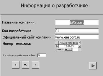 Данная форма – информация о разработчике. В ней также содержится вложенная форма ("Номер телефона"), а еще управляющие кнопки, с помощью которых можно листать записи, удалять их, а также закрыть форму.