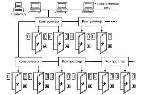 Кроме того, программное обеспечение больших систем позволяет использовать для управления сразу несколько компьютеров и осуществлять распределение исполнительных функций между ними. Например, можно на компьютер администратора возложить обязанности отслеживать местонахождение сотрудников и использование ими рабочего времени; оператору компьютера отдела кадров вменить в обязанность пополнять базу данных, печатать пропуска; на проходную установить компьютер с программами, помогающими идентифицировать личность, а на пост охраны - выводить тревожную графику и т. д. Большие системы, как правило, работают в самом тесном взаимодействии с другими инженерными системами объекта: охранной сигнализацией, с системами телевизионного наблюдения и контроля, с системами жизнеобеспечения, оперативной связи и др. Из-за невозможности удаленной установки от объекта управления данные контроллеры устанавливаются непосредственно внутри защищаемых ими помещений. Это не способствует снижению вероятности несанкционированного манипулирования контроллером, но имеет свои плюсы - при обрыве линии связи между контроллерами и компьютером система продолжает выполнять основные функции по управлению процессом доступа в автономном режиме. Наиболее часто в системах с распределенной архитектурой контроллер может управлять проходом в 1-2 двери. Типичный пример таких систем:
