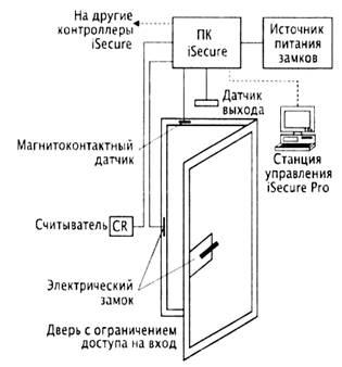 Автономные (локальные) СКУД, управляемые микрокомпьютером, как правило, обслуживают один КПП (возможно, с несколькими линейками прохода и соответственно контрольными терминалами). Идентификационная информация о пользователях и их полномочиях хранится в локальной базе данных. СКУД такого типа наиболее просты по конфигурации, но и наименее надежны с точки зрения возможности вывода их из строя. Они могут применяться в основном на тех объектах, где не требуется высокий уровень безопасности. Часто в литературе такие системы носят название однодверных. На рис. 1 приведена типовая схема построения такой системы.