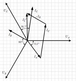 3. Для построения векторной диаграммы выбираем масштабы по току: 1см – 2 А, по напряжению: 1 см – 20 В. Построение диаграммы начинаем с векторов фазных напряжений , и , располагая их под углом 120° друг относительно друга. Ток отстает от напряжения на угол , ток отстает от напряжения на угол , а ток отстает от напряжения на угол (рис.3).