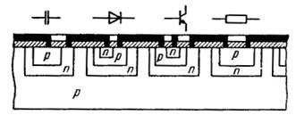 Универсальным элементом монокристаллической микросхемы служит р-n-переход, являющийся слоем, изолирующим микрообласти, сформированные в кристалле.