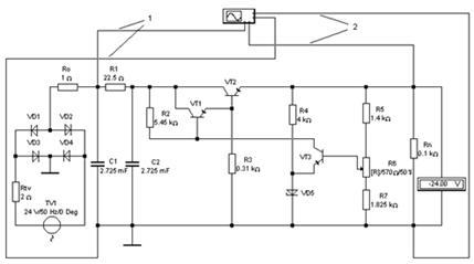 Из-за особенностей ElectronicsWorkbench вместо трансформатора был использован источник переменного напряжения с необходимыми выходными характеристиками (расчетными выходными характеристиками трансформатора). Были добавлены сопротивления Rtv (2 Ом) — сопротивление обмоток трансформатора; Ro (1 Ом) — согласующее сопротивление; Rn (0.1 кОм) — сопротивление блока СИФУ (Uвых/Iвых).