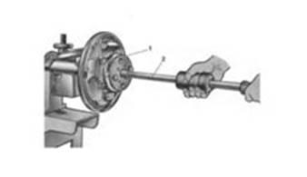 Рисунок 3.3 - Выпрессовка полуоси с помощью съемника 67.7801.9516: 1 — полуось; 2 — ударный съемник.