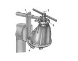 Рисунок 3.5 - Отвертывание самоконтрящейся гайки ведущей шестерни: 1 — стопор для фиксирования фланца ведущей шестерни; 2 — торцевой ключ; 3 — фланец ведущей шестерни; 4 —кронштейн для крепления редуктора на стенде.