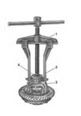 Рисунок 3.6 - Снятие внутреннего кольца заднего подшипника ведущей шестерни универсальным съемником А.40005/1/7: 1 — универсальный съемник А.40005/1/7; 2 — ведущая шестерня; 3 — внутреннее кольцо подшипника; 4 — приспособление А.45008.