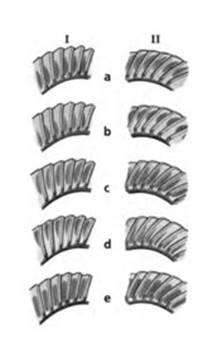 Рисунок 4.5 - Расположение пятна контакта в зацеплении шестерен главной передачи: I — сторона переднего хода; II — сторона заднего хода; а и в — неправильный контакт в зацеплении шестерен: отодвиньте ведущую шестерню от ведомой, уменьшив толщину регулировочного кольца; c и d — неправильный контакт: передвиньте ведущую шестерню к ведомой, увеличив толщину регулировочного кольца; е – правильный контакт в зацеплении шестерен.