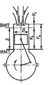 Рассмотрим основные параметры двигателя, связанные с его работой (рис. 2). Верхняя мертвая точка (ВМТ) — крайнее верхнее положение поршня. В этой точке поршень наиболее удален от оси коленчатого вала. Нижняя мертвая точка (НМТ) — крайнее нижнее положение поршня. Поршень наиболее приближен к оси коленчатого вала. В мертвых точках поршень меняет направление движения, и его скорость равна нулю. Ход поршня (S) — расстояние между мертвыми точками, проходимое поршнем в течение одного такта рабочего цикла двигателя. Каждому ходу поршня соответствует поворот коленчатого вала на угол 180° (пол-оборота). Такт — часть рабочего цикла двигателя, происходящего при движении поршня из одного крайнего положения в другое. Рабочий объем цилиндра (Vk) — объем, освобождаемый поршнем при его перемещении от ВМТ до НМТ. Объем камеры сгорания (Vc) — объем пространства над поршнем, находящимся в ВМТ. Полный объем цилиндра (Va) — объем пространства над поршнем, находящимся в НМТ: