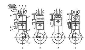 Рис. 4. Схема рабочего процесса четырехтактного дизеля: а — впуск; б — сжатие; в — рабочий ход; г — выпуск; 1 — топливный насос; 2 —поршень; 3 — форсунка; 4 — воздушный фильтр; 5 — впускной клапан; 6 —выпускной клапан; 7 — цилиндр; 8 — шатун; 9 — коленчатый вал