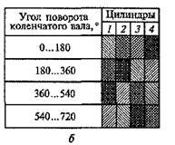 Рис. 5. Схема (а) и таблица (б) порядка работы четырехцилиндрового двигателя: 1, 2, 3, 4 — цилиндры двигателя