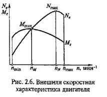 Внешней скоростной характеристикой двигателя называется зависимость эффективной мощности Neи крутящего момента Ме от частоты вращения коленчатого вала при полной подаче топлива. Эффективной называется мощность, развиваемая на коленчатом валу двигателя. Внешняя скоростная характеристика определяет возможности двигателя и характеризует его работу. По внешней скоростной характеристике определяют техническое состояние двигателя. Она позволяет сравнивать различные типы двигателей и судить о совершенстве новых двигателей.
