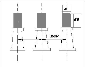 8.2 По справочнику выбираем алюминиевые шины марки АТ с размером полосы 60*8 мм, сечением 480 мм , с допустимым током 1025 А. Полоса установлена на ребро, расстояние между опорными изоляторами L=900 мм, расстояние между фазами a=260 мм.