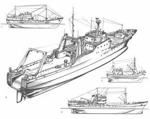 Если грузовые и пассажирские суда являются чисто транспортными, то промысловые суда - одновременно производственные и транспортные; у некоторых промысловых судов новых типов производственные средства стоят даже на первом месте. Методы рыболовства, принятые для этого оборудования, район эксплуатации, способы переработки и хранения улова определяют форму и, соответственно, тип промыслового судна.