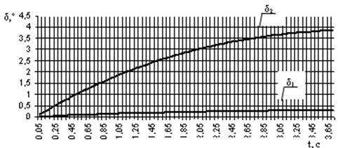 Рис.4. Изменение углов увода во времени первой и второй оси автомобиля со схемой 1-00-4