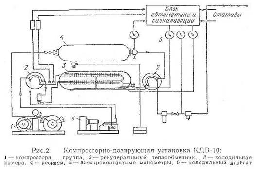 На АТС компрессорную сигнальную установку размещают таким образом: компрессорную группу и блок осушки и автоматики в смежном с шахтой помещении, а статив с кабелями в шахте. Каждый кабель соединяют с распределительным стативом полиэтиленовой или металлической индивидуальной трубкой. Контрольно-дозирующая установка КДВ-10 (рис.2) обслуживает до 100 кабелей емкостью от 100 до 1200 пар, в том числе до 10 кабелей с поврежденной оболочкой. При осушке воздуха в холодильной камере его сжимают до 88,2×10⁴Па, а затем охлаждают до -3,-7⁰C, при этом влага, имеющаяся в воздухе, конденсируется и периодически удаляется.