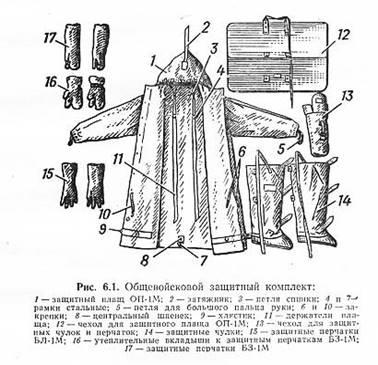 Общевойсковой защитный комплект состоит из защитного плаща, защитных чулок и защитных перчаток.