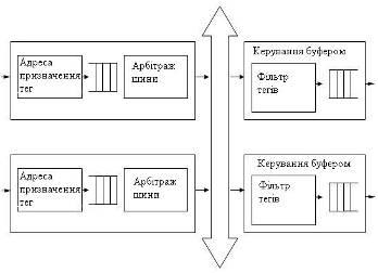 Кадр повинен передаватися по шині невеликими частинами, по декілька байт, щоб передача кадрів між декількома портами відбувалася в псевдопаралельному режимі, не вносячи затримок у передачу кадру в цілому. Вхідний блок процесора поміщає в комірку, прийнятний по шині, тег, у якому вказує номер порту призначення. Кожен вихідний блок процесора порту містить фільтр тегів, що вибирає теги, призначені даному порту. Шина, так само як і комутаційна матриця, не може здійснювати проміжну буферизацію, але тому що дані кадру розбиваються на невеликі комірки, то затримок з початковим очікуванням доступності вихідного порту в такій схемі немає - тут працює принцип комутації пакетів, а не каналів.