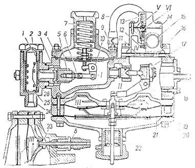 Розвантажувальний пристрій - діафрагменно-пружинного типу. Порожнина ІІІ якого з'єднана з впускною трубою двигуна. При розрідженні 70-80 мм водяного стовпа розвантажувальний пристрій відключається і розвантажує клапан другої ступіні редуктора. Пристрій редуктора і його окремих вузлів показане на мал. 7.9 , 10 і 11. На вході газу в редуктор установлений сітчастий фільтр.