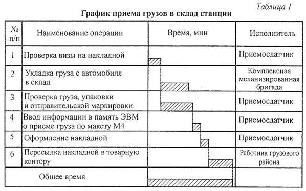 Несоответствие упаковки груза стандарту или техническим условиям, а также предъявления груза без упаковки или груза в поврежденном состоянии, если об этом не указано грузоотправителем в накладной, отсутствие или неясность маркировки является основанием для отказа в приеме груза к перевозке. О приеме груза к перевозке приемосдатчик записывает в Книгу приема груза к отправлению (форма ГУ-34). Подробный порядок заполнения книги указан в Инструкции по ведению станционной коммерческой отчетности, утвержденной МПС России. По окончании указанных операций приемосдатчик на оборотной стороне накладной в графе «Ввоз груза по частям»записывает данные о ввозе груза, удостоверяя их своей подписью, и пересылает ее в товарную контору. Порядок приема груза к перевозке на каждой станции имеет свои особенности, зависящие от местных условий. В таблице 1 приложения 3 приведен график приема груза в склад станции. Аналогичные графики разрабатывают для приема к перевозке в местах не общего пользования и по прямому варианту «автомобиль – вагон».