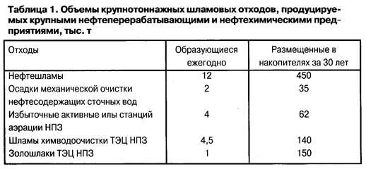 В табл. 1 представлены ориентировочные годовые объемы некоторых видов шламовых отходов, образующихся на НПЗ мощностью до 10 млн. т/год по сырой нефти.