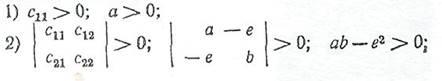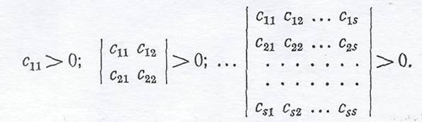 Чтобы определить условия, при которых рассматриваемая квадратичная форма является определенно положительной, воспользуемся критерием Сильвестра о знакоопределенности квадратичной формы: для того чтобы квадратичная форма была определенно положительной, необходимо и достаточно, чтобы все главные миноры ее дискриминанта были положительны, т. е. выполнялись следующие условия: