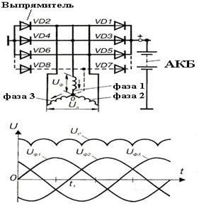 зависит от скорости вращения ротора генератора и подключённой нагрузки. Дабы уберечь силовой транзистор в момент закрытия от перенапряжения из-за ЭДС самоиндукции обмотки возбуждения, установлен обратный диод VD