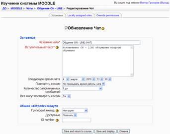 Как и при создании других ресурсов и элементов курса, оконная форма создания чата условно поделена на секции с полями, которые необходимо заполнить. В секции Основные требуется заполнить поля Название чата (отображается как ссылка в основном окне курса) и Вступительный текст (отображается участникам при входе в чат). Далее необходимо выставить дату и время, с которой чат будет доступен пользователям учебного курса, в полях Следующее время чата. Если в поле Повторять сесси выставить значение В это же время каждый день или В это же время каждую неделю, то чат будет доступен в определенное время ежедневно или еженедельно соответственно. В поле Количество запоминаемых сообщений необходимо задать время в днях (от 2 до 365), на протяжении которого сообщения будут храниться на сервере. Если предполагается хранить сообщения чата постоянно, то установите в этом поле значение Никогда не удалять сообщения. Будьте осторожны с этим параметром настройки и не устанавливайте без особой необходимости слишком большой срок хранения сообщений, т.к. это приведет к затратам дискового пространства на сервере. При завершении всех настроек нажмите кнопку Save and display , для сохранения изменений и просмотра результата. Или нажмите кнопку Отмена.