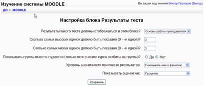 Для увеличения функциональности учебного курса добавлены блоки. Блок Календарь не только выводит даты и дни недели, но и позволяет вести общий для курса и личный органайзер каждому участнику обучающего курса. Блок Наступающие события отобразит, например, начало и окончание сроков сдачи практических занятий и тестов. Для вывода, например, трех лучших и трех худших результатов тестирования добавим блок Результаты теста. Таких блоков в обучающем курсе может быть несколько, на каждый тест свой блок результатов.