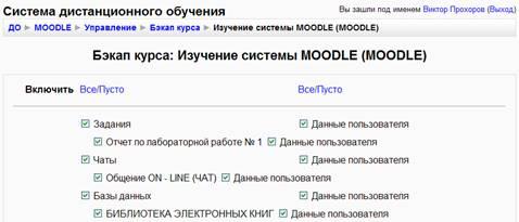 Регулярно выполняйте резервное копирование учебных курсов из блока Управление. Создав полную резервную копию своего электронного курса, вы можете всегда восстановить его в случае непредвиденных сбоев на сервере или перенести свой курс с одного сервера на другой, воспользовавшись ссылкой Восстановить в блоке Управление. Для получения отчета (на экран и в виде файла) об активности пользователей на вашем курсе воспользуйтесь ссылкой Отчеты. Таблицу с оценками на все виды работ и всех учащихся можно увидеть на экране и сохранить в файл для дальнейшей обработки, щелкнув по ссылке Оценки.