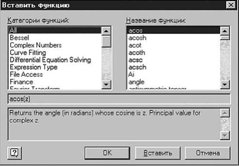 Mathcad имеет множество встроенных элементарных, специальных и статистических функций. Наиболее известные из них вполне можно ввести, используя их математические обозначения: sin(2.5), ln(5) и т.д. Однако большое количество функций не позволяет их запомнить. Для облегчения ввода математических функций на стандартной панели инструментов имеется кнопка f