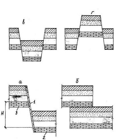 а - скид; б - насув; в - грабен; г - горст; 1 - зміщувач;