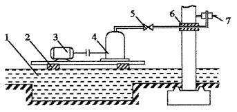 Рис. 6. Віброізоляція 1 – фундамент; 2 – амортизатори; 3 – електродвигун; 4 – насос-компресор; 5 – вентиль; 6 – пружна прокладка; 7 – кронштейн