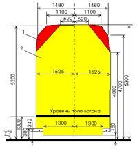зона нижней негабаритности — на высоте от 380 до 1400 мм при расстоянии от оси пути 1626 — 1760 мм и на высоте от 1230 до 1400 мм при расстоянии от оси пути 1761 — 2240 мм;