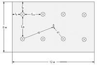 Для расчета намечаем контрольную точку А. Необходимо найти d1, d2 – проекции расстояния на потолок между точкой А и соответствующим светильником.
