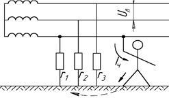 Дотикання до однієї фази 3-х фазної мережі із заземленою нейтраллю (рис. 4.).