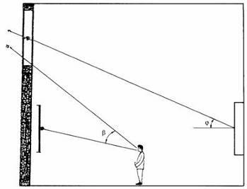При нормальном удалении посетителя от экспонатов (равном 1,5 высоты экспозиционной зоны) и ориентации глаз на середину выставочной зоны угол b (рисунок 1), под которым виден нижний край светопроема, должен быть не менее 30°. При высоте подоконников 1,2 м от пола и менее наружная стена и простенки не должны использоваться для экспозиции.