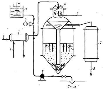 1 — греющий пар; 2,8 — подача исходной и отвод декремнизированной воды; 3 — водоподогреватель; 4 — реагентиый бак; 5 — напорный дозатор; 6 — осветлитель с каскадным подогревателем; 7 — фильтр, заполненный оксидом магния или антрацитом; 9 — насос для рециркуляции осадка