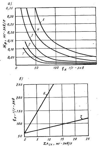 1 — 5 мг-экв/л; 2 — 7,0; 3 — 10; 4 — 15; 5 — 20, 6,7 — при прямоточной и противоточной регенерации