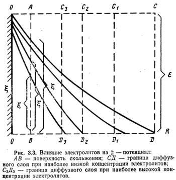 Изменение значения g-потенциала при сжатии диффузного слоя показано на рис. 3.3 (по оси абсцисс отложены расстояния от поверхности частички, по оси ординат — значения потенциалов). Степень влияния ионов зависит от их концентрации, валентности и размеров: чем выше концентрация ионов и их валентность, тем больше сжатие диффузного слоя, а следовательно, тем сильнее эти ионы снижают устойчивость коллоидных частичек.