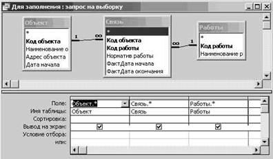 Создадим запрос на выборку в режиме конструктора, который должен обеспечивать получение данных об отставании (опережении) выполнения работы на каждом объекте. Используя все таблицы, выбираем из них Наименование объекта, Наименование работы, Дата начала, Норматив работы, ФактДата начала, ФактДата окончания