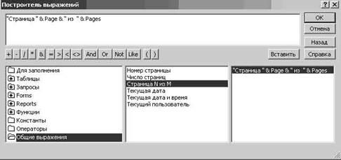 ) введем выражение =”Страница ” & [Page] &" из ”& [Pages] (Рисунок 13). Для даты в свойствах поля