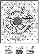 Рис. 7. Сечение метасоматически замещенного пегматита. По Н. Солодову.