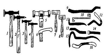 Рис. 2. Набір інструментів видалення вм'ятин: 1...6 - молотки; 7 і 8 - киянки; 9... 16 - оправки (ложки).